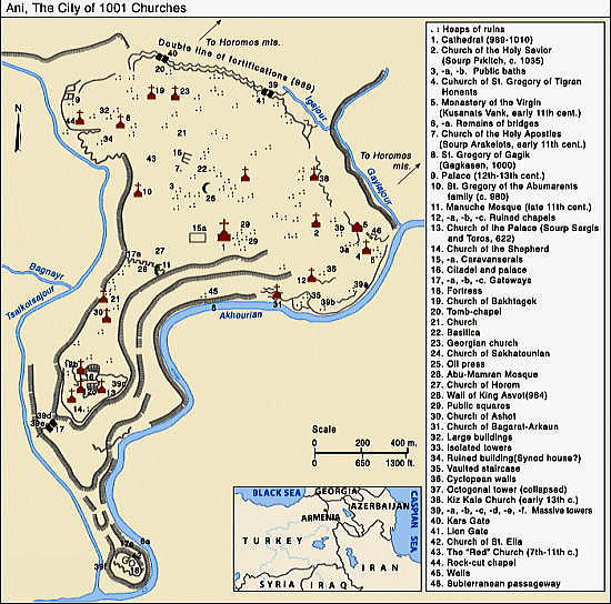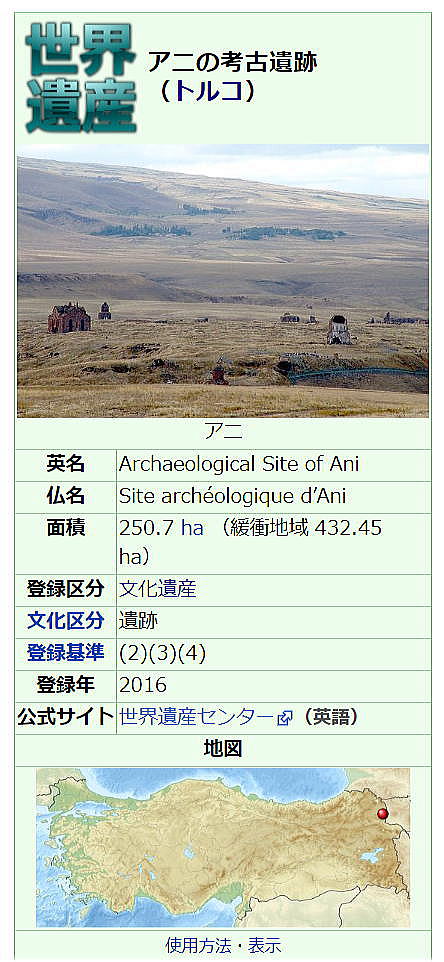| 総合メニュー(西アジア) トルコの世界遺産 世界遺産1 世界遺産1-2 世界遺産2 世界遺産3 世界遺産4 世界遺産5 世界遺産6 世界遺産7 世界遺産7-2 世界遺産7-3 世界遺産8 世界遺産9 世界遺産9-2 世界遺産9-3 世界遺産10 世界遺産11 世界遺産12 世界遺産13 世界遺産14 世界遺産14-2 世界遺産14-3 世界遺産14-4 世界遺産15 世界遺産16 世界遺産16-2 世界遺産16-3 世界遺産17 世界遺産17-2 世界遺産17-3 世界遺産17-4 世界遺産18 世界遺産18-2 次はトルコの世界遺産14です。 ◆・アニの考古遺跡 (2016年) ![]() 出典:Wikipedia ![]() アニ トルコ haigoes - https://web.archive.org/web/20161018134031/http://www.panoramio.com:80/photo/17749526, CC 表示-継承 3.0, リンクによる Source:Wikimedia Commons アニ (アルメニア語: Անի; ギリシャ語: Ἄνιον, Ánion; ラテン語: Abnicum; グルジア語: ანისი, Anisi;トルコ語: Anı, 英語: Ani)は、アルメニア人によって中世に建設されたシルクロードの商業都市。現在のトルコ共和国・カルス県にあり、アルメニア共和国との国境近くです。 アニはトルコとアルメニアの国境にあるアルパチャイ渓谷に、シルクロードの商業都市として9世紀初めに建設されたまちです。 961年から1045年までのアニは、今日のアルメニア共和国からトルコ共和国東部までの広い範囲を領土としたバグラトゥニ朝アルメニアの首都でした。シルクトードなど様々な交易ルートが交わる場所にあり、アニにある多くの宗教建築物・宮殿・要塞は、技術的・芸術的に見て世界でもっともすぐれた構造を有していました。 アニは「千と一の教会がある都」と表現され、最盛期には約100,000の人口を有したとされています。長きにわたって華麗さや壮麗さで知られていたものの、1236年にはモンゴル人によって略奪され、1319年の地震によって荒れ果てました。その後、17世紀までには単なる村へと落ちぶれ、ほとんど忘れ去られました。 アニはアルメニア人にとっての文化的・宗教的・国家的な遺産として広く認識されています。2016年には「アニの考古遺跡」としてユネスコの世界遺産(文化遺産)に登録されました。 地理 ![]() アニの街とその周囲の地理 www.armenica.org - www.armenica.orgOriginal upladed to en.wikipedia: en:Image:AniMap.gif, CC 表示-継承 3.0, リンクによる Source:Wikimedia Commons 東側はアフリアン川の渓谷、西側はBostanlar谷やTzaghkotzadzor谷に挟まれた、天然の要塞といえる三角形の場所に位置しています。アフリアン川はアラス川の支流であり、トルコ共和国とアルメニア共和国の自然的国境を形成しています。火山性凝灰岩からなる丘の上に位置しており、その標高は約1,340mです。この地域の中心都市であるカルスはアニの42km西にあります 。 歴史 5世紀にはイェギシェやGhazar Parpetsiのようなアルメニア人年代史家が初めてアニに言及しました。丘の上に建つ強固な要塞として、またアルメニア人のカムサラカン家の所有地としてアニを説明しています。 バグラトゥニ朝の首都 ![]() アニの旗 Gegart - upload to ru-wiki, CC 表示-継承 3.0, リンクによる Source: Wikimedia Commons かつてArsharunik のカムサラカン家が有していた領土や、今日のシラク地方に相当する領土(アニを含む)は、9世紀初頭まで、アルメニア人のバグラトゥニ家の領土に組み込まれていました。804年、バグラトゥニ家の首領であるアショト4世 (806年–827年)は、イスラーム王朝のアッバース朝からアルメニア公の称号を与えられました。 イスラーム王朝のカリフは宗教政策的な観点から、勢力が及ぶ範囲で他宗教の教会の新設は許さなかったとされていますが、アルメニアでは例外的に多数のアルメニア教会が新設された。 バグラトゥニ朝 (885年-1045年)における最初の首都は、アニの40km南に位置するバガラン であり、その後アニの25km北東に位置するシラカヴァン に移されましました。929年には首都がカルスに移されましたが、961年にはアショト3世 (治世953年–977年)によって首都がアニに移されました。 つづくスムバト2世 (治世977年–989年)はアニの街の発展に力を注ぎ、聖堂や多くの教会が建設されました。ドヴィン がイスラーム教徒に破壊されたのを機に、アルメニアのカトリコス(総主教)座はドヴィンからヴァン湖を経て、992年にアニに移されました。 これによってアニは首都であるだけではなく、アルメニアの宗教的な中心地にもなっています。10世紀のアニの人口は50,000から100,000と推定されています。 最盛期 1000年頃のバグラトゥニ朝アルメニアの領土 アニの勢力がピークに達したのは、ガギク1世の治世(989年-1020年)です。かつてのアニは重要な交易路には沿っていなかったのですが、その都市規模・勢力・富などが理由で、この時代には重要な交易拠点となっていました。当時の西アジアでは人口100万人を数えるバグダッドが経済の中心にあり、他地域でも商業都市の地位が高まった時代でした。 アニは「40の門がある都市」「千と一の教会がある都」として知られ、バグラトゥニ朝の歴代の王の霊廟はアニに建設されました。主な交易相手には、ビザンツ帝