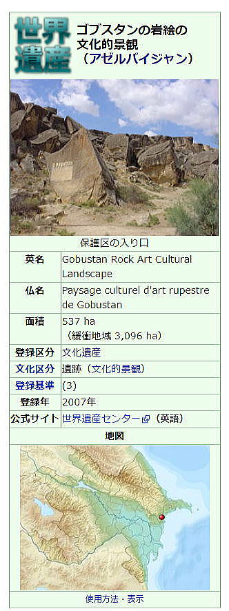 | 総合メニュー(西アジア) アゼルバイジャン1 アゼルバイジャン2 アゼルバイジャン3 アゼルバイジャン4 世界遺産1 世界遺産2 次はアゼルバイジャンの世界遺産2のゴブスタン国立保護区です。 ◆アゼルバイジャンの世界遺産2 ゴブスタン国立保護区 ![]() 出典:Wikipedia ![]() 保護区の入り口 コンピュータが読み取れる情報は提供されていませんが、KristianEllisWoodだと推定されます(著作権の主張に基づく) - コンピュータが読み取れる情報は提供されていませんが、投稿者自身による作品だと推定されます(著作権の主張に基づく), パブリック・ドメイン, https://commons.wikimedia.org/w/index.php?curid=619080による Source:Wikimedia Commons ゴブスタン国立保護区(ゴブスタンこくりつほごく)は、アゼルバイジャン・ゴブスタン(Qobustan)の西部にある1966年に設定された保護区。この年に、アゼルバイジャンは、この地の古代の彫刻物群や泥火山を守るために、国定史跡に設定したのである。首都バクー中心部からは40マイル南西にある。2007年にユネスコの世界遺産に登録された(登録名は「ゴブスタンの岩絵の文化的景観」)。 ゴブスタン国立保護区は考古学的な記念碑類が多く残っており、岩絵は60万点を超えている。岩絵に描かれているのは、太古の人類や動物、戦い、宗教的な舞踏、闘牛、武装した漕ぎ手の乗る小舟、槍を携えた戦士、ラクダの隊商、太陽や星々など多彩で、平均して5000年から20000年遡ると考えられている[1]。 今日のゴブスタンは、アゼルバイジャンで一番人気のある国立保護区で、この国にとってかけがえのない宝庫になっている。 先史的彫刻群 この地域に見られる数々の岩絵は、コーカサスにおける先史時代の生活の魅力的な姿を伝えています。 保存状態の良好な岩絵からは、アシの舟に乗って旅をする人々、レイヨウやスイギュウを狩る男たちや踊る女性たちの姿が読み取れます。 ノルウェーの有名な人類学者トール・ヘイエルダールは、1961年から、亡くなる2002年までの間、何度もアゼルバイジャンを訪れ、彼のSearch for Odinプロジェクトの一環として、この保護区の研究を行いました。 ![]() ゴブスタンの岩刻壁画 コンピュータが読み取れる情報は提供されていませんが、KristianEllisWoodだと推定されます(著作権の主張に基づく) - コンピュータが読み取れる情報は提供されていませんが、投稿者自身による作品だと推定されます(著作権の主張に基づく), パブリック・ドメイン, リンクによる Source:Wikimedia Commons 泥火山 ![]() 泥火山 Nick Taylor - originally posted to Flickr as Gobustan Mud Volcnoes, CC 表示 2.0, リンクによる Source:Wikimedia Commons 地球に700ある泥火山のうち、400がゴブスタンとカスピ海にあると見積もられています。多くの科学者たちも地元の人同様、ゴブスタンのような場所を訪れると最後には、薬効があるとされる泥を塗ってみたくなるといいます。 泥火山は地下で固まっていない泥が断層など割れ目を伝って地表に吹き上がって出来きまあす。約20年間に一度の周期で生じると言われています。 2001年にバクーから15 kmのところにある泥火山が世界でニュースになりました。突然に15 mもの高さの炎を吹き上げたからです。拝火教(ゾロアスター教)が生まれた理由はこのような地質現象に関係があると見られています。 世界遺産 遺産登録 ゴブスタン国立保護区は、1998年に世界遺産の暫定リストに登録され、2004年に審議されたが、そのときは調査不足などから登録見送りが決定された。しかし、2007年の第31回世界遺産委員会で再審査された結果、「ゴブスタンの岩絵の文化的景観」の名で、世界遺産への登録が認められた。 登録基準 この世界遺産は世界遺産登録基準のうち、以下の条件を満たし、登録された(以下の基準は世界遺産センター公表の登録基準からの翻訳、引用)。 (3) 現存するまたは消滅した文化的伝統または文明の、唯一のまたは少なくとも稀な証拠。 へつづく |