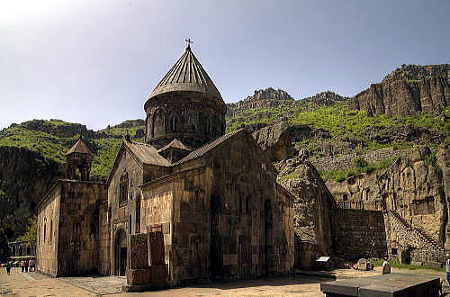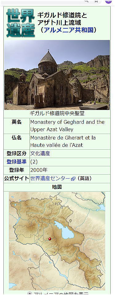 | 総合メニュー(西アジア) アルメニア1 アルメニア2 アルメニア3 エレバン 世界遺産1 世界遺産2 世界遺産3 次はアルメニアの世界遺産2 ゲガルド修道院とアザト川上流域です。 ◆アルメニアの世界遺産2 ゲガルド修道院とアザト川上流域 ![]() 出典:Wikipedia ![]() ギガルド修道院中央聖堂 Սէրուժ Ուրիշեան (Serouj Ourishian) - 投稿者自身による作品, CC 表示-継承 3.0, Source:Wikimedia Commons ギガルド修道院とアザト川上流域は、アルメニア共和国にあるユネスコの世界遺産登録物件名です。登録は2000年。キリスト教・非カルケドン派のアルメニア使徒教会の修道院建築とその周辺地域を対象としています。 概略 ギガルド修道院は、301年に歴史上初めてキリスト教を国教と定めたアルメニアでも古い歴史を持つ修道院で、初期キリスト教時代にはすでに開設されていたと伝えられています。 アイリヴァンク、すなわち洞窟修道院とも呼ばれ、院域のいくつかは岩盤を穿って造られた洞窟となっています。修道院の名称である「ギガルド」は槍を意味する言葉で、キリストの脇腹を突いた聖槍の一部がここで発見されたことにちなんでします。 今日残っている中央聖堂は、1215年から1283年にかけて建設されたものですが、僧院や礼拝堂、食堂などは、中央聖堂北側に接する岩盤を穿って造られ、天井はイスラーム建築のムカルナスの影響によると思われる鍾乳石装飾で覆われています。 僧院内には、十字架を彫った石盤がいたるところに設置されています。 世界遺産 登録基準 この世界遺産は世界遺産登録基準のうち、以下の条件を満たし、登録された(以下の基準は世界遺産センター公表の登録基準からの翻訳、引用)。 (2) ある期間を通じてまたはある文化圏において、建築、技術、記念碑的芸術、都市計画、景観デザインの発展に関し、人類の価値の重要な交流を示すもの。 写真ギャラりー ![]() Holy Mother of God church in Geghard in Armenia Gerd Eichmann - 投稿者自身による作品, CC 表示-継承 4.0, リンクによる Source:Wikimedia Commons ![]() Gavit of Holy Mother of God church in Geghard in Armenia Gerd Eichmann - 投稿者自身による作品, CC 表示-継承 4.0, リンクによる Source:Wikimedia Commons ![]() Holy Mother of God church in Geghard in Armenia Gerd Eichmann - 投稿者自身による作品, CC 表示-継承 4.0, リンクによる Source:Wikimedia Commons ![]() Upper Gavit in Geghard in Armenia Gerd Eichmann - 投稿者自身による作品, CC 表示-継承 4.0, リンクによる Source:Wikimedia Commons ![]() Jhamatun and chapel of the Proshians in Geghard in Armenia Gerd Eichmann - 投稿者自身による作品, CC 表示-継承 4.0, リンクによる Source:Wikimedia Commons ![]() Khatchkar in Geghard Gerd Eichmann - 投稿者自身による作品, CC 表示-継承 4.0, リンクによる Source:Wikimedia Commons へつづく |