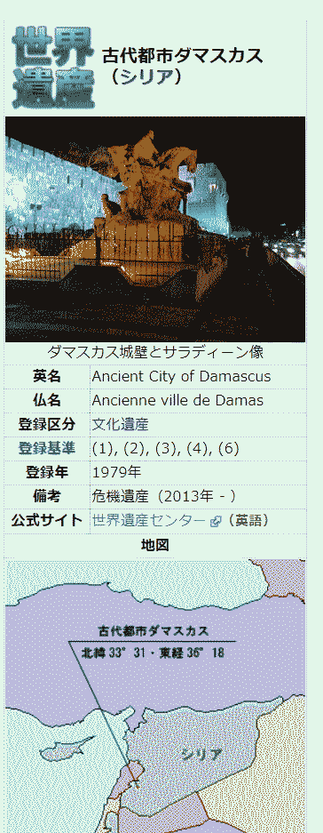 | 総合メニュー(西アジア) シリアの世界遺産 世界遺産1 世界遺産2 世界遺産2-2 世界遺産3 世界遺産3-2 世界遺産4 世界遺産4-2 世界遺産5 世界遺産6 次はシリアの世界遺産1です。 ◆古代都市ダマスカス ![]() 出典:Wikipedia ![]() ダマスカス城壁とサラディーン像 Photo by Yosemite, CC 表示-継承 3.0, リンクによる Source:Wikimedia Commons 古代都市ダマスカス(こだいとしダマスカス)は、シリアの首都ダマスカスの旧市街に残る歴史的な構造物が登録されたユネスコの世界遺産(文化遺産)です。 1979年に登録されました。2013年にシリア内戦による被害のため、シリア国内の他の5つの世界遺産とともに危機遺産に登録されました。 概要 エジプト、メソポタミア、地中海地域を結ぶ交通の要衝の地として、紀元前3000年ごろから形成された都市です。中東でも最古の都市の1つです。 バラダ川の南側にあるダマスカス旧市街(Old Damascus)は、城壁に囲まれた歴史のある地域です。この城壁は、1世紀頃、ローマが最初に建設したと言われています。 2004年現在残っているものは、13世紀から14世紀にかけて、十字軍やモンゴル帝国の侵略を防ぐために、アラブ人が建築したものです。城壁には、7つの門が残っています。旧市街地は、狭い入り組んだ道になっていますが、東西に走る真っ直ぐな道(Straight Street)は、新約聖書にも登場しています。 世界最古のモスクといわれる、ウマイヤド・モスクも旧市街地にあります。 歴史 エジプトとメソポタミアを結ぶ交通の要衝であり、紀元前3000年ごろから都市が形成しはじめたと考えられています。 アレキサンダー大王の東征以後は、ギリシャ、ローマ帝国の支配下に置かれています。 635年、アラブ人が侵入。661年から750年まで、ウマイヤ朝の首都として栄えます。 1946年、シリアの首都となります。 主な建築物 城壁 城塞 (Citadel) アゼム宮殿 ウマイヤド・モスク ![]() ウマイヤド・モスク ウマイヤ朝の支配下、715年に建築された世界最古のモスク。建設には10年以上の月日が費やされたといわれている。 Yosemite - 投稿者自身による作品, パブリック・ドメイン, リンクによる Source:Wikimedia Commons ![]() 古代都市ダマスカスの地図を表示 Dr. Blofeld - OpenStreetMap, CC 表示-継承 2.0, リンクによる Source:Wikimedia Commons イスラム教の4大聖地の1つに数えられており、シリア国内はもちろん、周辺のイスラム諸国から巡礼ツアーが訪れる。非イスラム教徒の入場も許可されているが、入る門は制限されている。また、成人女性の入場にはベール等で髪を隠すことが義務付けられている。 ![]() شهر دمشق سوریه Tasnim News Agency, CC 表示 4.0, リンクによる Source: Wikimedia Commons サラーフッディーン廟 ウマイヤド・モスクの北門近くにある十字軍を撃退した英雄サラーフッディーン(サラディン)を埋葬している建物。城砦近くには、馬に跨ったサラーフッディーンの銅像も建っている。 ![]() サラーフ=アッディーンと考えられる肖像画 在位 1169年 - 1193年 Ismail al-Jazari (1136–1206) - This file has an extracted image: File:Portrait of Saladin (before A.D. 1185).jpg., パブリック・ドメイン, リンクによる Source:Wikimedia Commons ![]() 15世紀の装飾写本中の「エジプトの王、サラディン」 Originally from [1], パブリック・ドメイン, リンクによる Source:Wikimedia Commons 世界遺産の登録基準 この世界遺産は世界遺産登録基準のうち、以下の条件を満たし、登録された(以下の基準は世界遺産センター公表の登録基準からの翻訳、引用です)。 (1) 人類の創造的才能を表現する傑作。 (2) ある期間を通じてまたはある文化圏において、建築、技術、記念碑的芸術、都市計画、景観デザインの発展に関し、人類の価値の重要な交流を示すもの。 (3) 現存するまたは消滅した文化的伝統または文明の、唯一のまたは少なくとも稀な証拠。 (4) 人類の歴史上重要な時代を例証する建築様式、建築物群、技術の集積または景観の優れた例。 (6) 顕著で普遍的な意義を有する出来事、現存する伝統、思想、信仰または芸術的、文学的作品と直接にまたは明白に関連するもの(この基準は他の基準と組み合わせて用いるのが望ましいと世界遺産委員会は考えている)。 世界遺産2へつづく |
