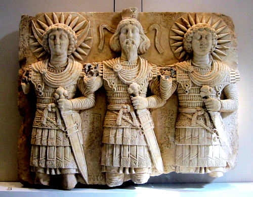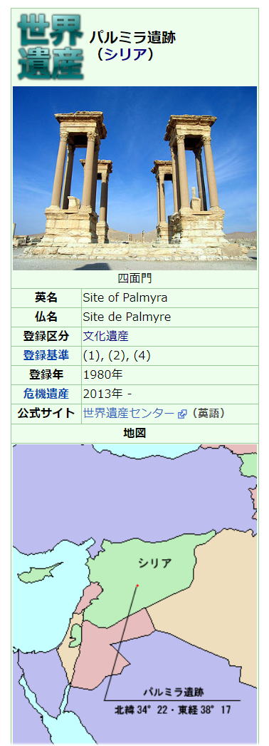 | 総合メニュー(西アジア) シリアの世界遺産 世界遺産1 世界遺産2 世界遺産2-2 世界遺産3 世界遺産3-2 世界遺産4 世界遺産4-2 世界遺産5 世界遺産6 次はシリアの世界遺産3です。 ◆パルミラ ![]() 出典:Wikipedia ![]() パルミラの神々。左から、月の神アグリボル(Aglibôl)、最高神バアル・シャミン(バアルシャメン、Beelshamên)、太陽神マラクベル(Malakbêl)。1世紀ごろの浮彫、シリアの Bir Wereb, Wadi Miyah 付近で発見、ルーヴル美術館所蔵。 コンピュータが読み取れる情報は提供されていませんが、World Imagingだと推定されます(著作権の主張に基づく) - コンピュータが読み取れる情報は提供されていませんが、投稿者自身による作品だと推定されます(著作権の主張に基づく), CC 表示-継承 3.0, リンクによる Source:Wikimedia Commons パルミラ(英語: Palmyra)は、シリア中央部のホムス県タドモルにあるローマ帝国支配時の都市遺跡。シリアを代表する遺跡の1つです。1980年、ユネスコの世界遺産(文化遺産)に登録されました。21世紀初頭までローマ様式の建造物が多数残っており、ローマ式の円形劇場や、浴場、四面門が代表的でありましたが、シリア内戦で破壊を受けました。ラテン語読みによるパルミュラとも呼ばれています。 概要 パルミラの遺跡は、シリアの首都ダマスカスの北東、約215kmのシリア砂漠の中にあります。ユーフラテス川流域からは南西へ約120km。海抜は400mで、シリア中央部を北東方向へ伸びる山脈(Jabal Abu Rujmayn)の南麓に位置します。北から流れるワジアブオベイド川と、西から流れるワジアイド川が形成した扇状地にあるオアシスに建設されていました。 パルミラのある東西方向の谷間は、地中海沿岸のシリアやフェニキアと、東のメソポタミアやペルシアを結ぶ交易路となっており、パルミラはシリア砂漠を横断するキャラバンにとって非常に重要な中継点でした。 紀元前3世紀頃から多数の地下墓地が建設され、当時からアラム語で現在のアラビア語名と同じく「タドモル」 תדמר (Tadmor) と呼ばれていました。 ナツメヤシの産地として知られたオアシス都市であり、アラム語やヘブライ語など北西セム語ではナツメヤシの実のことを תמר (tamar) といい、都市名はナツメヤシと関係があるともされます。ギリシア語でナツメヤシのことを「パルマ」ということから、ギリシア人やローマ人から「パルミラ」と呼ばれたようです。 しかしこれとは別に、「タドモル」の語源は、「ダマール(破壊)」や、「タトモル(覆う、包む)」に関連するともいわれ、また、古代西セム語の語根である「ダムル(保護する)」から「守備隊駐屯地」によるともいわれています。 紀元前1世紀から3世紀までは、シルクロードの中継都市として発展し、交易の関税により都市国家として繁栄しました。 ローマの属州となったこともあります。2世紀にペトラがローマに吸収されると、通商権を引き継ぎ絶頂期に至りました。この時期、パルミラにはローマ建築が立ち並び、アラブ人の市民は、東のペルシャ(パルティア)式と西のギリシャ・ローマ式の習慣や服装を同時に受容していました。 「軍人皇帝時代」にパルミラ王国が成立し、270年頃に君臨したゼノビアの時代にはエジプトの一部も支配下に置いていた。しかし、ローマ皇帝ルキウス・ドミティウス・アウレリアヌスは、当時分裂状態にあった帝国の再統一を目指してパルミラ攻撃を開始。273年にパルミラは陥落し、廃墟と化した。 この後パルミラは衰え、東ローマ帝国やイスラム帝国の支配下にあった時代は街の大半が廃墟のままでした。中世には完全に放棄されたものの、現在では遺跡と同じ名のタドモル(タドムル)という新しい町がすぐ横に建設されています。 歴史 パルミラの近くからは、約7万5000年前の旧石器時代の石器が発見されています。 ユーフラテス河畔のマリ遺跡で発掘された紀元前2000年代頃の粘土板からも、この都市の名前(Tadmor、または Tadmur、または Tudmur)と思われる記述が見つかっています。 旧約聖書の『歴代誌第二』8章4節では、古代イスラエルの国王ソロモンが荒れ野に「タドモル」の街を築いたと記されています。『列王記第一』の9章18節でも、ソロモンが築いた街や基地の中に「תמר」(タモル Tamor またはタマル Tamar)の名がみられますが、伝統的にこの部分は「タドモル」と読むことになっており、タルムードやミドラーシュの冊子にある注釈のいくつかでは、この街をシリア砂漠にあると記しています。 フラウィウス・ヨセフスの『ユダヤ古代誌』第8巻においても、タドモルはソロモンが創建したと書かれ、ギリシア語のパルミラの名も併記されています。現代ヘブライ語においてもパルミラはタドモルと呼ばれます。 タドモル(パルミラ)の人々はアラブ人でしたが、アラム語の方言(パルミラ語)を話し、アラム文字を手直しした独自の文字(パルミラ文字)を用いていました。パルミラ文字は今も遺跡の各所に残ります。 セレウコス朝からローマ時代 アケメネス朝ペルシャから