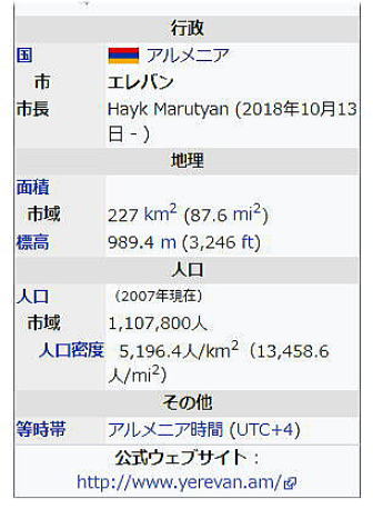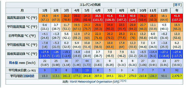 | 総合メニュー(西アジア) アルメニア1 アルメニア2 アルメニア3 エレバン 世界遺産1 世界遺産2 世界遺産3 次はシルクロードの中間点にあるアルメニアのエレバンです。 ◆エレバン(Yerevan) ![]() ![]() ![]() Source:Wikipedia エレバン(Երևան、Yerevan [jɛɾɛˈvɑn])は、アルメニア共和国の首都です。イェレヴァン、エリバン(Erivan)、エレブニ(Erebuni)、エレウン(Ereun)と呼ばれていたこともあります。 人口約106万人(2004年)です。機械製造や金属業、ワイン、ブランデー製造、たばこ製造業が盛んです。フラズダン川が市内を流れます。南にアララト山を臨む。現存する世界最古の都市の一つとされており、また創世記に語られている「エデンの園」が存在していたという伝承のある地でもあります。 歴史 紀元前8世紀ごろにはすでにウラルトゥのエレブニ要塞がアルギシュティ1世によって、北カフカースからの攻撃に備え、この地に築かれていました。 紀元前4世紀までにはアケメネス朝のアルメニア・サトラップの主要な町になっていました。ヨーロッパと中央アジア、インドを結ぶ交易路の中継地であったため、658年、アラブによって征服されます。 その後、アルメニア人のバグラト朝の中枢として栄えます。1387年、ティムールによる包囲、略奪に遭います。イルハン朝の中心都市の一つともなります。 ![]() 1672年のエレバン Source:Wikimedia Cmmons 以後、オスマン帝国とサファヴィー朝の角逐の場となっていきます。1604年にはアッバース1世の命により、多くの市民がペルシアに連れ去られました。 1679年には大地震に見舞われました。サファヴィー朝では、エレバン・ハン国に編入されます。 1827年、第二次ロシア・ペルシア戦争においてロシア帝国がガージャール朝を撃破し、1828年のトルコマンチャーイ条約でロシア領となりました。その後、エレバンには多くのアルメニア人がペルシアから帰還してきます。 1854年以降、都市計画がなされ、多くの大学が設立され、ギュムリやトビリシ、アゼルバイジャン方面への鉄道建設がなされました。 ロシア帝国が崩壊すると、1918年、中世以来の独立国家となったアルメニア共和国において、エレバンは首都となっました。1920年にアルメニアが共産化し、1922年にソビエト連邦構成共和国を構成する共和国の一つとしてアルメニア・ソビエト社会主義共和国が誕生した際にも、エレバンはその首都となり続けていました。 エレバンはアルメニア人建築家アレクサンドル・タマニアンの都市計画に基づき、近代都市へと作り変えられて行きました。 1965年、アルメニア人虐殺50周年を巡るエレバンでの抗議運動は、ソ連における最初の大規模な反ソ運動へと発展しました。1966年に市内のツィツェルナカベルトに虐殺の追悼碑が建立されました。 1991年9月21日、ソ連崩壊に伴ってアルメニア共和国が独立を宣言した後も、エレバンは首都であり続けている。 地勢 標高1,000m程で、アララト平野の南東に位置する。三方を山に囲まれ、南はフラズダン川に向かって下降しています。フラズダン川が市を2つに分けています。 ![]() エレバン市街とアララト山 Source:Wikimedia Cmmons 気候 ケッペンの気候区分では湿潤大陸性気候に属します。内陸で盆地的な地形から夏は極めて暑く、40°C近くまで上がることもある一方、冬季は寒さが厳しく、-15 °C以下になることも多いのです。積雪も多く、近郊の山々はスキー場となっています。 エレバンの気候 ![]() 出典: World Meteorological Organisation (UN), 民族構成 ソ連時代は、ロシア人、クルド人、アゼリー人、イラン人も多く居住していましたが、1988年のナゴルノ・カラバフ戦争でアゼリー人の人口は消滅し、アルメニア人と入れ替わった。ロシア人の多くも1990年代の経済不況でエレバンを離れました。 従って、住民の多くはアルメニア人となりましたが、ヨーロッパや北米への移民流出が続き、人口は減り続けました。人口が増加に転じたのは、2007年以降です。 経済 アルメニアのGDPの過半はエレバンが生み出します。1990年以降、深刻な経済不況が続いていますが、石油化学産業、アルミニウム産業等が盛んです。水力発電も盛んです。ワインやブランデー(アルメニアン・コニャック)の生産でも名高いです。 文化 マテナダラン - 古文書館 エチミアジンの大聖堂と教会群ならびにズヴァルトノツの考古遺跡 - 市内から西に20kmにエチミアジンに世界遺産のエチミアジン大聖堂があります。 教育 高等教育機関 エレバン国立大学 (Yerevan State University) エレバン国立薬科大学 (Yerevan State Medical University) エレバン国立工学大学 (Yerevan State Engineering University) エレバン音楽院 (Yerevan Komitas State Conservatory) 交通 ![]() ズヴァルトノッツ国際空港 Source:Wikimedia Cmmons エレバンの西10kmのズヴァルトノッツに位置する国際空港です。アルマヴィアの本拠地です。2004年から拡張工事が開始され、新国際線ターミナルは2007年に完成しました。もう一つの新ターミナルは2012年に完成予定予定。 エレバン駅(サスンティダ