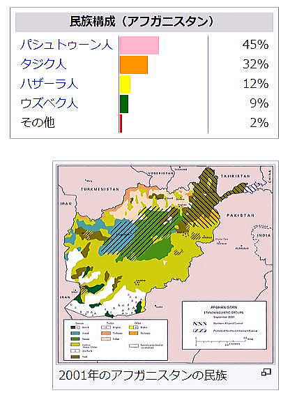 | 総合メニュー(中央・西アジア) アフガニスタン アフガニスタン1 アフガニスタン2 アフガニスタン3 アフガニスタン4 アフガニスタン5 アフガニスタン6 次はアフガニスタン5です。 ◆アフガニスタン5 交通 ![]() 首都カーブルと南部のカンダハールを結ぶ幹線道路 Source: Wikimedia Commons 交通インフラストラクチャーも度重なる戦乱により破壊され、またはメインテナンスが行われていなかったために現在も復興が行われています。なお、多くの先進諸国でみられるような高速道路網はないものの、主要都市間は舗装された幹線道路によって結ばれており、長距離バスによる移動が行われています。 かつては国際列車カイバル鉄道(カブール〜パキスタン国ペシャワール間)がありましますが、戦乱で荒廃し不通となっている。 現在、アフガン公共事業庁の監督のもと、ウズベキスタン国境の貨物駅Hayratanからマザーリシャリーフまでの鉄道建設が進んでおり、2011年8月20 - 21日に開業しまし。また、首都カーブルには1992年当時トロリーバスが存在しましたが、現在は存在しません。 なお、諸外国との交通は上記の長距離バスによって行われているほか、カーブル国際空港をハブとした国営航空会社のアリアナ・アフガン航空や、そのほかに乗り入れる外国航空会社の定期便で結ばれています。 国民 ![]() 2001年のアフガニスタンの民族 主要民族 (2003年推計) Source: Wikimedia Commons 民族 民族構成(アフガニスタン) パシュトゥーン人 45%、タジク人32%、ハザーラ人、12%、ウズベク人9%、その他 2%。 パシュトゥーン人 45%、言語:パシュトー語(イラン語群)、宗教:ハナフィー派スンニー タジク人 32%、言語:ダリー語、タジク語(イラン語群)、宗教:ハナフィー派スンニー、イスマイール派シーア(北部の若干)ハザーラ人 12%、言語:ハザラギ語(イラン語群、ダリー方言)、宗教:イマーム派シーア、イスマイール派シーア、スンニー(極少数)ウズベク人 9%、言語:ウズベク語(テュルク諸語)、宗教:ハナフィー派スンニー トルクメン人、言語:トルクメン語(テュルク諸語)、宗教:ハナフィー派スンニー そのほかにアイマーク人、ヌーリスターン人、バローチ人(英語版)、パシャイー人(英語版)など (言語と宗教は前田(2002)p.14より)。 言語 公用語 パシュトー語 ダリー語(アフガン・ペルシア語) 地方言語 ウズベク語 トルクメン語 バローチー語 パシャイ語 ヌーリスターン語 その他 ハザラギ語 アイマク語 キルギス語 ブラーフーイー語 パミール語 ヒンドコ語 アラビア語 グジャール語 宗教 ![]() カーブルのアブドゥッラフマーン・モスク Source: Wikimedia Commons スンナ派 85%(特にハナフィー学派) シーア派 14% その他 1% その他には、シーク教徒、ヒンドゥー教徒、キリスト教徒が存在する[69]。 イスラム教から他宗教への改宗には死刑が適用されましたが、2006年、ドイツでキリスト教に改宗した人の死刑判決に対し国際的非難を浴びたことでこの法律は撤廃され、現在は布教活動も許されるようになりました。2006年8月、ターリバーンは韓国人のキリスト教宣教師を拉致監禁し、キリスト教の宣教活動をやめるよう要求した事件がありました。 文化 食文化 国民の99%がイスラム教であり、アルコール類の取り扱いが禁じられている。 小麦で練ったナーンやビリヤニなどが有名。飲料としてはチャイがよく飲まれる。 かつては飲酒文化が栄えてたという。 世界遺産 アフガニスタンには多くの貴重な遺跡が残っており、以下の2つがユネスコの世界遺産に登録されている。 ![]() ・ジャームのミナレットと考古遺跡群(2002年) ![]() ・バーミヤーン渓谷の文化的景観と古代遺跡群(2003年) バーミヤーン渓谷には大仏と多くの壁画が残されていましたが、紛争により破壊され続け、殊に2体の大仏は破壊されつつ持ちこたえ立ち続けていましたが、2001年にターリバーンによって完全に破壊されました。 アフガニスタンに関する作品 映画 モフセン・マフマルバフ 『サイクリスト』『カンダハール』『アフガン・アルファベット』 サミラ・マフマルバフ 『午後の五時』 ハナ・マフマルバフ 『ハナのアフガンノート』『子供の情景』 セディク・バルマク 『アフガン零年』 マーク・フォースター 『君のためなら千回でも』 ティモー・ベクマムベトフ 『エスケープ・フロム・アフガン』 マイク・ニコルズ 『チャーリー・ウィルソンズ・ウォー』 ピーター・マクドナルド『ランボー3/怒りのアフガン』 ジョン・フランケンハイマー『ホースメン(英語版)』 評論 『アフガニスタンの仏像は破壊されたのではない恥辱のあまり崩れ落ちたのだ』 モフセン・マフマルバフ フンザ1へつづく |