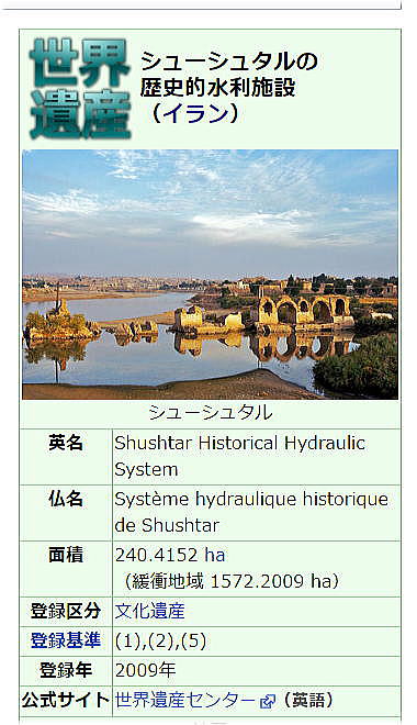 | 総合メニュー(西アジア) イランの世界遺産 世界遺産1 世界遺産2 世界遺産3 世界遺産4 世界遺産5 世界遺産6 世界遺産7 世界遺産8 世界遺産9 世界遺産10 世界遺産11 世界遺産12 世界遺産13 世界遺産14 世界遺産15 世界遺産16 世界遺産17 世界遺産18 世界遺産19 世界遺産20 世界遺産21 世界遺産22 世界遺産23 次はイランの世界遺産10です。 ◆イランの世界遺産10 シューシュタルの歴史的水利施設 (2009年) ![]() 出典:Wikipedia ![]() 出典:Wikipedia ![]() シューシュタルの歴史的水利施設 (2009年) Ali Afghah - [1], パブリック・ドメイン, リンクによる Source:Wikimedia Commons 概要 シューシュタル (شوشتر) は、イラン・フーゼスターン州にある古代以来の要塞都市です。州都アフヴァーズより約 92 km 離れたところに位置しており、2005年現在の人口は約9万人です。 歴史 水利施設の建設と繁栄、衰退まで シューシュタルは、アケメネス朝時代には Šurkutir と呼ばれていました。この名前は、アケメネス朝の首都であったスーサにも関連しており、スーサよりも立派な都市を意味します。 サーサーン朝時代になると、シューシュタルはカルン川 (en) に浮かぶ中州となり、サーサーン朝における夏の首都に選ばれました。 カルン川は、シューシュタルを囲む堀の役割を果たし、東・西・南の三方にシューシュタルの町へ渡ることが可能な橋がかけられました。シューシュタルのそばを流れる幾筋の河川がシューシュタル周辺の農業の発展に貢献しました。そこでは、サトウキビや主要農産物が生産されました。 サーサーン朝のシャーであるシャープール1世は、ローマ帝国皇帝ウァレリアヌスを打ち破った際に、ローマ人捕虜を用いて、カエサルの橋と呼ばれる 550 m の長さに及ぶ巨大な橋梁・ダムを建設させています。 シューシュタルの周辺に張り巡らされた水利網を Ghanat と呼び、河川とため池や建物とを結び、シューシュタルの町に水を供給しました。戦時には、シューシュタルの城門は閉じられました。これらの Ghanat 群は、今日でも、シューシュタルの地下室でも見受けられます。 19世紀になると、シューシュタルの水利施設は存亡の危機に立たされました。結果として、19世紀以降、シューシュタルは衰退の一途をたどり、1973年にモハンマド・レザー・パフラヴィーがシューシュタルの再建に動くまで、衰退が続くこととなりました。 1973年以降 1973年、パフラヴィー朝は、19世紀以降、水利施設が荒廃していたシューシュタルの再建に乗り出しました。 塔、ダム、橋などで構成され、カールーン川のギャルギャル運河とシャティート運河の2つの主要な運河を含み、ギャルギャル運河は製粉場に通じるトンネルを経由して、現在もシューシュタル市に水を供給し、フーゼスターン州における農業を振興させました。 カルン農業産業会社 (Karun Agro-Industries Corporation) によって、シューシュタル旧市街の対岸にシューシュタル・ニュータウンと呼ばれる町が建設されました。シューシュタル・ニュータウンの建設によって、シューシュタルにおける砂糖産業に従事している労働者の住居を提供する一方で、シューシュタル旧市街の再生に関心を持たせると同時にこの地方の経済発展を目指していました。 2009年、シューシュタルの水利施設はUNESCO の世界遺産に「シューシュタルの歴史的水利施設」として登録されました。 ◆写真ギャララリー ![]() シュシター (トリップアドバイザー提供) ![]() シュシター (トリップアドバイザー提供) ![]() シュシター (トリップアドバイザー提供) ![]() シュシター (トリップアドバイザー提供) ![]() シュシター (トリップアドバイザー提供) ◆シューシュタルの歴史的水利施設の世界遺産への登録基準 この世界遺産は世界遺産登録基準のうち、以下の条件を満たし、登録された(以下の基準は世界遺産センター公表の登録基準からの翻訳、引用)。 (1) 人類の創造的才能を表現する傑作。 (2) ある期間を通じてまたはある文化圏において、建築、技術、記念碑的芸術、都市計画、景観デザインの発展に関し、人類の価値の重要な交流を示すもの。 (5) ある文化(または複数の文化)を代表する伝統的集落、あるいは陸上ないし海上利用の際立った例。もしくは特に不可逆的な変化の中で存続が危ぶまれている人と環境の関わりあいの際立った例。 世界遺産11へつづく |