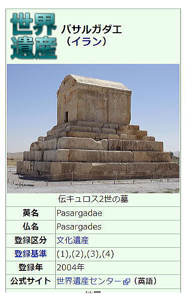 | 総合メニュー(西アジア) イランの世界遺産 世界遺産1 世界遺産2 世界遺産3 世界遺産4 世界遺産5 世界遺産6 世界遺産7 世界遺産8 世界遺産9 世界遺産10 世界遺産11 世界遺産12 世界遺産13 世界遺産14 世界遺産15 世界遺産16 世界遺産17 世界遺産18 世界遺産19 世界遺産20 世界遺産21 世界遺産22 世界遺産23 次はイランの世界遺産5です。 ◆イランの世界遺産5 パサルガダエ (2004年) ![]() 出典:Wikipedia ![]() パサルガダエの位置 出典:グーグルマップ ![]() パサルガダエ (2004年) Behrad18n - en.wikipedia, Copyrighted free use, リンクによる 概要 パサルガダエ(古代ギリシア語: Πασαργάδαι パサルガダイ、ペルシア語: پاسارگاد パーサールガード)は、アケメネス朝のキュロス2世によって建設された、当時のペルシャ帝国の首都で、キュロス2世の墓が存在します。今日では、ユネスコの世界遺産に登録されています。 名称 古代ギリシア語でパサルガダイと呼ばれた。パサルガダエはそのラテン語化した形です。 古代ペルシア語で何と呼ばれていたかは不明ですが、ペルセポリスから発見されたエラム語刻文に「Batrakataš」の名を記していることから、*Pāθra-gadā のような名前だったのではないかと考えられています。 遺跡 パサルガダエはペルセポリスの北東87キロメートルに位置し、現在のファールス州にあります。 パサルガダエは、ペルシャ帝国の最初の首都であり、紀元前546年に、キュロス2世の手によって建設が開始されました。しかし、その建設は途上に終わりました。というのも、紀元前530年前後の遊牧民マッサゲタイとの戦争中に、キュロス自身が戦死したからです。ダレイオス1世がスーサに遷都するまで、パサルガダエは、ペルシャ帝国の首都として機能しました。 パサルガダエ考古遺跡は、1.6平方キロメートルの広さであり、キュロス2世の墓と伝えられる建造物、丘の近くにそびえるタレ・タフト要塞と2つの王室の庭園から構成されます。 パサルガダエに残る庭園は、イランで最初の四分法に基づいて建設されたペルシャ式庭園です。庭園部分は、パサルガダエ考古遺跡とは別に、2011年、UNESCOの世界遺産に登録されました。 パサルガダエの土木工学における最近の研究では、ハカーマニシュ朝の技術者は震度7の地震でも耐えうる設計をパサルガダエに施していました。今日では『免震』(Base Isolation)と呼ぶ方法を用いていますが、この建築方法は、原子力施設で今日も多くの国が採用している方法であり、また、日本のような巨大地震が頻発する国で用いられている免震方法です。 パサルガダエ考古遺跡で最も重要な部分は、キュロス2世のものと伝えられている墳墓です。6段の階段が墳墓へとつながり、墓室は、高さ2.11メートル、幅2.11メートル、奥行き3.17メートルの大きさであり、低くて狭い入り口を持ちます。 キュロス2世の墳墓という確証はまったく無いわけですが、ギリシャの歴史学者がアレクサンドロス大王がキュロスの墓であると信じていたということを今日に教えてくれています。 アレクサンドロスは、ペルセポリスを破壊したときに、キュロス2世の墓を訪問したとされます。2世紀の歴史家であるアッリアノスは、「アレクサンドロスは、彼の部下の戦士であるアリストブレスに墳墓の中に入るように命令した」と記録していました。墓の中には、金色のベッド、杯とテーブル、金色の棺桶、高価な宝石がちりばめられた装飾品と墓碑を見つけ出しました。現在では、それらの痕跡はありません。 パサルガダエ考古遺跡の建築様式は、同時代のアナトリアの墳墓と強い結びつきがあるという。特にパサルガダエの墳墓は、リディア王クロイソスの父であるアリュアッテス2世の墓とほぼ同じです。しかし、多くの人々がこの主張を斥ける(ヘロドトスの言説に従うと、クロエススは、キュロス2世によるリディア征服の間、除名され、キュロスの宮廷のメンバーのひとりとなっていました)。キュロス2世は、自らの墓を建設するのに、リディアの墓建築の様式を移入したのではないかと推測する学者もいます。 一般にパサルガダエ考古遺跡で発見される芸術作品や建築物は、エラム、バビロニア、アッシリア、古代エジプトからの先例に基づき、かつ、いくらかのアナトリアの影響を受けた形でのペルシャ美術の統合体の一例となっています。 イスラームによるイラン征服時代、アラブ人の軍隊は、パサルガダエ考古遺跡にたどり着いた際に、パサルガダエ考古遺跡を破壊する計画を持っていました。当時の墓守は、アラブ人の軍隊にパサルガダエは、キュロス2世を奉じて作られたのではなく、ソロモン王の母を尊重して作られたとどうにか信じさせる事によって、破壊を回避しました。その結果、墓碑は、クルアーンの韻文に取って代わられ、今日では、ソロモン王の母の墓と知られるようになりました。 スィーヴァンドダム建設計画と遺跡 スィーヴァンドという町に、ちなんで名前を付けられたスィーヴァンドダムの問題が、