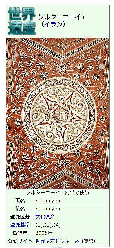 | 総合メニュー(西アジア) イランの世界遺産 世界遺産1 世界遺産2 世界遺産3 世界遺産4 世界遺産5 世界遺産6 世界遺産7 世界遺産8 世界遺産9 世界遺産10 世界遺産11 世界遺産12 世界遺産13 世界遺産14 世界遺産15 世界遺産16 世界遺産17 世界遺産18 世界遺産19 世界遺産20 世界遺産21 世界遺産22 世界遺産23 次はイランの世界遺産7です。 ◆イランの世界遺産7 ソルターニーイェ (2005年) ![]() 出典:Wikipedia ![]() ソルターニーイェの位置 出典:グーグルマップ 概要 ソルターニーイェ(現代ペルシア語 سلطانيه Solṭānīye、前近代の近世ペルシア語・アラビア語ではスルターニーヤ Sulṭānīya )は、イルハン朝第8代君主オルジェイトゥの命によって建設された都市遺跡です。テヘランの北西240kmのザンジャーン州東部にあり、かつて14世紀には、フレグ・ウルスの都でした。 ソルターニーヤ(スルターニーヤ)とはアラビア語で「スルターンに関わるもの」の意味し、このスルターンとはオルジェイトゥ(・スルターン・ムハンマド・フダーバンダ)のことであり、スルターンの御座所、すなわち首都ほどの意味になります。2005年、ユネスコの世界遺産に登録されました。 ソルターニーイェの遺跡群の中核は、1302年から1312年にかけて建設されたオルジェイトゥ廟です。8基のミナレットを備えるこの廟は、青タイルで覆われた高さ約50mの2重構造のドームを持ち、これは世界最古のものです。イスラーム世界におけるこの廟の重要性は、ブルネレスキの屋根建築と比較されます。 ソルターニーイェの建築は後のイスラーム建築に大きな影響を与えた。ソルターニーイェの影響を受けた建築物としては、カザフスタンのホージャ・アフマド・ヤサヴィー廟やインドのタージ・マハルがああります。 廟の外装のほとんどが失われてしまいましたが、、内部のモザイク、彩色陶器、壁画は残っています。 歴史 ![]() ソルターニーイェ内部の装飾 CC 表示-継承 3.0, リンク Source:Wikimedia Commons オルジェイトゥによる建設 元々シャルーヤーズ Shūryāz と呼ばれていたところで、東南はアブハル Abhar 川、西北はザンジャーン川の分水嶺となっており周囲を遠望できる広大で緩やかな丘陵地帯に立地し、良好な草地に恵まれた土地でした。 モンゴル帝国・イルハン朝時代にモンゴル遊牧部族民によって好適な夏の放牧地として親しまれ、モンゴル語で「黄褐色の草地」を意味するクンクル・ウラン( قونقور اولانگ Qūnqūr-Ūlāng < qoŋur-olaŋ)と称されるようになりました。このため、イルハン朝の第2代君主アバカ以来、歴代君主の夏の幕営地(夏営地、ヤイラク yaylaq )のひとつとして重要視され、特に第4代アルグンは夏営地として好み、タブリーズ近郊に建設した都市アルグーニーヤに匹敵する新しい都市の建設を構想していました。また、この地の東にあったスジャース Sujās 山中に自らの墓所を営み、山域一帯を禁地( قورغ qūrugh < qoriγ〜qoruγ)と定めていました。 上述の通りスルターニーヤを建設したのは第8代君主でアルグンの息子オルジェイトゥです。彼は父アルグンの遺命としてクンクル・ウランにタブリーズに準ずる新首都の建設を企図しましたが、これも即位して間もなくに都市建設を着工したものと考えられます。 イルハン朝や後の時代に編纂された年代記資料では、このスルターニーヤ建設の起工と竣工の時期について明確に記述がないため判断が難しいのですが、諸々の記述から即位翌年の1305年春には着工され、1313年8月29日にスルターニーヤ市内に建設された城塞で催されたオルジェイトゥの大宴がその竣工式だったのではないかと考えられています。 オルジェイトゥ即位後は、君主の夏営地としてスルターニーヤはほぼ固定されオルジェイトゥは治世13年間のうち11回におよぶ宮廷(オルド)の夏営をスルターニーヤ(クンクル・ウラン)で過ごしていまする(「スルターニーヤ」の名前は1307年の夏営が初出です)。 規模 ![]() オルジェイトゥ廟 オリジナルのアップロード者は英語版ウィキペディアのZereshkさん - en.wikipedia からコモンズに Latebird が CommonsHelper を用いて 移動されました。, CC 表示-継承 2.5, リンクによる Source:Wikimedia Commons 建設されたスルターニーヤの規模について、オルジェイトゥの息子アブー・サイードに仕えた財務官であったハムドゥッ ラーフ・ムスタウフィー・カズヴィーニーが著した地理書『心魂の歓喜(Nuzhat al-Qulūb)』によると、前近代の他の中央アジアから中東一帯の諸都市と同じく、スルターニーヤも市街地 شهر shahr と城塞 فلعة qal'a の部分から成り立っていました。 当初アルグンが築いた城壁は周囲12,000歩(gām)でしたが、オルジェイトゥは在世中に完成せずに終わったものの市街地を囲む外城壁はこれの2.5倍にあたる30,000歩にまで拡充し、周囲2,000歩の城塞を切り石作りの城壁で囲ったといいます。 城塞の内部は宮殿の他に病院やマドラサなどもあり、オルジェイトゥ以外にもモンゴル人のアミールたちも様々な建物を建て、大理石や焼