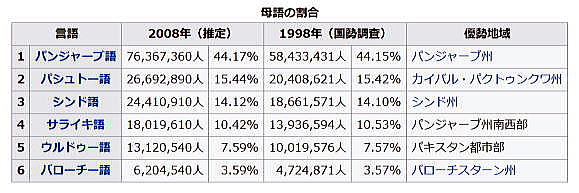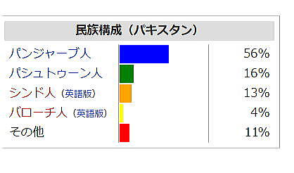 | 総合メニュー(西アジア) パキスタン1 パキスタン2 パキスタン3 パキスタン4 パキスタン5 パキスタン6 次はパキスタン5です。 ◆パキスタン5 (Pakistan) 民族構成 ![]() 民族構成(パキスタン) Source:Wikimedia Cmmons パンジャーブ人56%(60%とも)、パシュトゥーン人16%(13%とも)、シンド人13%、バローチ人4%、カラシュ人など。 宗教 イスラム教97%(国教)、ヒンドゥー教1.5%、キリスト教1.3%、ゾロアスター教0.2%など、ほかにアニミストも存在しています。 ゾロアスター教の信者は10万人くらいで、地方によってはカースト制度なども残っています。 婚姻 結婚時に妻は結婚前の姓をそのまま用いること(夫婦別姓)も、夫の姓に変えること(夫婦同姓)も可能。イスラム法では夫の姓に変えることを求めておらず、イスラム系住民は婚前の姓をそのまま用いることが多いと言えます。 言語 ウルドゥー語(国語)、英語に加え、パンジャーブ語、シンド語、カシミール語、コワール語といったインド語群のほか、イラン語群のパシュトー語およびバローチー語、ドラヴィダ語族のブラーフーイー語、孤立した言語ブルシャスキー語などがある。 現行の1973年憲法251条はパキスタンの国語をウルドゥー語としており、1988年までに英語に代えてウルドゥー語を公用語化することになっていましが、2004年現在も実現にいたっていません。同時にウルドゥー語が公用語化されるまでは英語を公用語とする旨規定しています。憲法を始めとする全ての法令や、公文書は英語で書かれています。政府の公式ウェブサイトは英語でだけ書かれています。全ての高等教育機関が英語を教授言語としています。 ただ、ほとんどの初等中等教育はウルドゥー語で行われているため、英語を自由に操るパキスタン国民はあまり多くありません。母語を異にするもの同士が会話する時は、ウルドゥー語を用いることが多いのです。ウルドゥー語を母語にするパキスタン人は全人口の一割以下です。 ウルドゥー語は北部諸語とはやや近いもののシンド語とは離れており、さらに南部でウルドゥー語を母語とするムハージル人(パキスタン独立時にインドから逃れてきた難民の子孫)とシンド語を母語とするシンド人との間に対立があるため、ウルドゥー語の公用語化には特に南部で反対が強いと言えます。 母語の割合 ![]() Source:Wikimedia Commons 文化 ![]() モヘンジョダロ オリジナルのアップロード者は英語版Q52のM.Imranさん - en.wikipedia からコモンズに移動されました。, CC 継承 1.0, リンクによる Source:Wikimedia Commons ![]() ブロンズ製のチャリオットと運転手(紀元前2000年) ハラッパー遺跡 Miya.m - Miya.m's file, CC 表示-継承 3.0, リンクによる Source:Wikimedia Commons 著名な遺跡として世界遺産になっているインダス文明のモヘンジョ・ダロ遺跡とクシャーナ朝時代に繁栄したタキシラの都市遺跡があります。ほかに標式遺跡となったハラッパー遺跡があります。 古典音楽は北インドと同じヒンドゥースターニー音楽。イスラム神秘主義の宗教歌謡カッワーリーの大歌手ヌスラト・ファテー・アリー・ハーンは、パンジャーブ地方で生まれています。 食文化 パキスタン国内にはアジア最初のビール醸造所として知られるマリー醸造所)(マリー・ブルワリー)があり、非ムスリム向けにマリービールが製造されています。フンザ地方においては、ワインがよく飲まれています。 世界遺産 パキスタン国内には、ユネスコの世界遺産リストに登録された文化遺産が6件存在します。背かい遺産については、別途詳細を紹介します。 文化遺産 モヘンジョ・ダロの考古遺跡(1980年) タキシラ(1980年) タフテ・バヒーの仏教遺跡群とサハリ・バハロールの近隣都市遺跡群(1980年) タフテ・バヒー サハリ・バハロール ラホールの城塞とシャーラマール庭園(1981年、2000年から2012年まで危機遺産登録) タッターの文化財(1981年) ロータス・フォート(1997年) 暫定遺産リスト パキスタンは以下の物件を暫定遺産リストに登録しています。 バードシャーヒー・モスク(1993年) ワズィール・ハーン・モスク(en:Wazir Khan Mosque、1993年) ジャハーンギール廟、アシフ・ハーン廟、アクバルのキャラバンサライ(en:Tomb of Jahangir、1993年) シェイフプーラのヒラン・ミナール(en:Hiran Minar、1993年) ムルターンのシャー・ルクネ・アーラム(en:Rukn-e-Alam、1993年) ダドゥのラニコート・フォート(en:Ranikot Fort、1993年) タッターにあるシャー・ジャハーンのモスク(1993年) チャウカンディーの墓(en:Chaukhandi tombs、1993年) メフルガルフの考古遺跡(en:Mehrgarh、2004年) レーマン・デリの考古遺跡(en:Rehman Dheri、2004年) ハラッパー考古遺跡(2004年) ラニガットの考古遺跡(2004年) Shahbazgarhi Rock Edicts(2004年) バルティット・フォート(en:Baltit Fort、2004年) ビビ・ジャウィンディ、バハ・ハリームの墓、ジャラールッディン・ブハーリー・モスク(2004年) ムルターンのシャー・ルクネ・アーラム(en:Rukn-e-Alam、2004年) Port of Banbhore(2004年) 司法・人権侵害 パキスタンではイスラム教徒・非イスラム教徒を問わず、イ