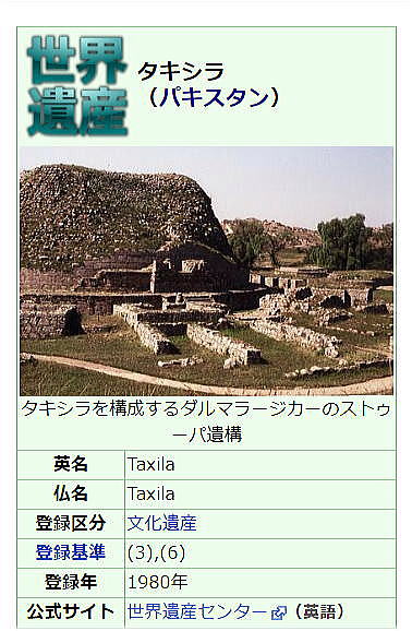 | 総合メニュー(西アジア) パキスタンの世界遺産 世界遺産1A 世界遺産1B 世界遺産1C 世界遺産2A 世界遺産2B 世界遺産2C 世界遺産2D 世界遺産2E 世界遺産3 世界遺産4A 世界遺産4B 世界遺産4C 世界遺産4D 世界遺産5 世界遺産6A 世界遺産6B 世界遺産6C 次はパキスタンの世界遺産2Aです。 ◆タキシラ(1980年) 2A ![]() ![]() コンピュータが読み取れる情報は提供されていませんが、World Imagingだと推定されます(著作権の主張に基づく) - コンピュータが読み取れる情報は提供されていませんが、投稿者自身による作品だと推定されます(著作権の主張に基づく), パブリック・ドメイン, リンクによる Source:Wikimedia タキシラはパキスタン・パンジャーブ州にあるガンダーラ時代に始まる遺構です。 その歴史は紀元前6世紀まで遡ることが可能であり、六派哲学の一つであるヴェーダーンタ学派、また、インドの仏教の中心の役割を果たしてきました。1980年にユネスコの世界遺産に登録されました。 タキシラは歴史的に3つの重要な交易路が交差する場所に位置していました。1つはマガダ国の首都パータリプトラから続く道であり、1つがバクトリアやペシャーワルといった北西から続く道、最後の1つがシュリーナガル、マーンセヘラー、 ハリープル渓谷を経由してシルクロードへとつながる道です。 タキシラは、パキスタンの首都イスラマバードの西、もしくはラーワルピンディーから北西にそれぞれ約35kmの、グランドトランク・ロードから少し外れた場所にあります。 歴史 伝説上では、タクシャシラという王国がタキシラを中心とする地域を支配したとされます。サンスクリットでは、タクシャシラとは、タクシャ王に所属する土地を意味します。 タクシャは、インドの叙事詩『ラーマーヤナ』に登場するバラタの子供とされます。また、インドを代表するもう1つの叙事詩『マハーバーラタ』では、クル王国の戴冠がタキシラで行われたと伝えられています。 タキシラの始まりは、アケメネス朝における一州として出発しています。時代としては、ダレイオス1世の時代とされていますが(en:Achaemenid invasion of Indus Valley)、アケメネス朝によるタキシラの支配は長いものではありませんでした。 また、パンジャーブ州には考古学上、アケメネス朝時代の遺構は残されていません。 紀元前518年にアケメネス朝の支配が始まったとされています。 ダモーダル・ダルマーナンド・コーサンビーの説によれば、タキシラとは「大工」を意味する「タクシャカ」という言葉と関わりがあり、この「タクシャカ」はナーガ族の別称であったと思われます。 紀元前326年、アケメネス朝を征服したアレクサンドロス大王がヒンドゥークシュ山脈を越え、インダス川流域に侵入しました。当時のパンジャーブ地方は小王国が乱立していた状態であり、タキシラを支配していたアーンビ(ヒンディー語: Ambhi、古代ギリシア語: Taxiles)は、アレクサンドロスに加勢しました。 その結果、アレクサンドロスは、パウラヴァ(Paurava)の王で政敵ポロスを撃破することに成功しまし。その後、アレクサンドロスは、将軍Eudemusを派遣しサトラップとして派遣していたPeithonをインドから引き上げさせました。 紀元前321年、チャンドラグプタが現在のパンジャーブ地方を含む北西インドの征服に着手を開始しました。その後、チャンドラグプタは、マウリヤ朝を建国するにいたったのです。 タキシラを含むパンジャーブ地方は、マウリヤ朝の支配下に入りました。チャンドラグプタの孫であるアショーカ王の時代には、タキシラは仏教の中心地となりました。とはいえ、必ずしもタキシラ自体は、マウリヤ朝に完全に服従していたというわけでもなく、たびたびマウリヤ朝に対しての反乱が起きました。 タキシラはマウリヤ朝の滅亡の現場にもなりました。紀元前185年、最後の王であるブリハドラタが部下によって暗殺されました。 このころ、パンジャーブ地方に隣接するガンダーラ地方ではデメトリオス1世率いるグレコ・バクトリア王国の活動が活発となっていました。 バクトリアは、ガンダーラを征服し、さらに、パンジャーブ地方を経てインダス川流域を征服しました。デメトリオス1世は、タキシラの対岸にシルカップ(Sirkap)を建設しました。インド・グリーク朝とも呼ばれるこの時代、数回の王朝交代が起きましたが、その間、タキシラは王朝の都として繁栄を極めました。この時代に鋳造された貨幣がタキシラの遺跡から出土しています。 ![]() タキシラで発掘された硬貨 I, PHGCOM, CC 表示-継承 3.0, リンクによる Source:Wikimedia Commons インド・グリーク朝を滅亡に追いやったのはスキタイ人です。紀元前90年、スキタイ人の部族長が最後のギリシャ系の王をタキシラから追放したまし。 紀元前25年には、ゴンドファルネスがタキシラを支配し、その後、インド・パルティア王国を建国することで、パルティアから離脱しました。その際にもタキシラはインド・パルティア王国の首都として機能しまし