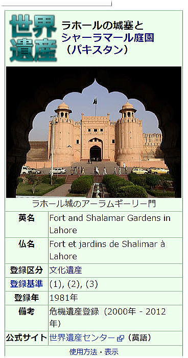 | 総合メニュー(西アジア) パキスタンの世界遺産 世界遺産1A 世界遺産1B 世界遺産1C 世界遺産2A 世界遺産2B 世界遺産2C 世界遺産2D 世界遺産2E 世界遺産3 世界遺産4A 世界遺産4B 世界遺産4C 世界遺産4D 世界遺産5 世界遺産6A 世界遺産6B 世界遺産6C 世界遺産6D 次はパキスタンの世界遺産4Aです。 ◆ラホール城塞 ![]() ホール城塞は、パキスタン・パンジャーブ州ラホールにある歴史的建造物。市街の北西に位置し、城内にはシーシュ・マハル、アーラムギーリー門、ノウラーカー・パビリオン、モーティー・マスジドといった有名な遺跡が存在します。 城塞は、1400フィート×1115フィートの広さがあります。1981年、同じラホール市内のシャーラマール庭園とあわせて、ユネスコの世界遺産に登録されました。 ラーホル街の人々の間で用いられるローカルな名称として、「シャーヒー・キラー(شاہی قلعہ)」(「王の城」)とも呼ばれています。 ![]() ラホール城のアーラムギーリー門 CC 表示-継承 1.0, リンク Source:Wikimedia Commons 歴史 ラホール城の歴史ははっきりとわかっていません。街とラホール城の誕生は、神話の時代(『ラーマーヤナ』の時代)にまでさかのぼってしまいます。 とはいえ、1959年に実施された発掘調査によると、1025年に鋳造されたガズナ朝のスルタンであるマフムードの名前が刻印された硬貨が、ラホール城遺跡で25mの深さから発見されました。 また、それよりさらに15m深い地層からは、1021年のマフムードによるガズナ朝の征服以前から人の住んでいた痕跡が発見されました。このことからラホール城の歴史は、1180年から1186年にかけてラホールから征服活動を展開したシハーブッディーン・ムハンマド(ゴール朝)の時代よりも古いことが明らかとなりました。 1241年にモンゴル帝国の征服活動によっていったん破壊されましたが、1267年にバルバンによって再建されました。1398年、ティムールの軍隊によって、再度の破壊を経験し、1421年には、ムバーラク・シャーによる再建、1432年のカーブルのシャイフ・アリーによる征服をラホール城は受けました。 現在のラホール城は、ムガル帝国時代に築かれたものが多く、1566年、アクバルの手によって、再建されました。その再建は、ラホール城の古い基盤をもとに、煉瓦建築が築かれました。アクバルは、加えて、王室の謁見の間として有名な「ダウラト・ハーナイェ・ハーソ・アーム」(Daulat Khana-ye-khas-o-Am)を作りました。 1618年には、ジャハーンギールは、ジャハーンギールの謁見の間が増築されました。加えて、庭園や寝所の増設が行われました。 1631年以降、シャー・ジャハーンによって、鏡の間、妃の寝室として使用され絢爛豪華な鏡のモザイクで埋め尽くされた夢の王宮、浴場、隠退の間、1645年には、40本柱の間と呼ばれる謁見の間、真珠のモスクが造営されました。 さらに、1674年には、アウラングゼーブによって、場外に赤砂岩の壁と白大理石の3つのドームを持つ金曜モスクが造営されました。 これ以後も1849年までの間に、ラーヴィー川に向かって、ラホール城は拡張工事が続けられました。 世界遺産登録基準 この世界遺産は世界遺産登録基準のうち、以下の条件を満たし、登録された(以下の基準は世界遺産センター公表の登録基準からの翻訳、引用)。 (1) 人類の創造的才能を表現する傑作。 (2) ある期間を通じてまたはある文化圏において、建築、技術、記念碑的芸術、都市計画、景観デザインの発展に関し、人類の価値の重要な交流を示すもの。 (3) 現存するまたは消滅した文化的伝統または文明の、唯一のまたは少なくとも稀な証拠。 世界遺産4Bへつづく |