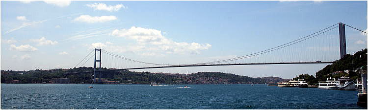 | 総合メニュー(中央・西アジア) トルコ1 歴史 トルコ2 文化 トルコ3 現代 2016年クーデター未遂 トルコ6 カッパドキア トルコ7 カッパドキア イスタンブル モスク モスク モスク2 モスク3 カパルチャルシュ ボスポラス海峡 ボスポラス大橋 エジプシャン・バザール トプカプ宮殿1 トプカプ宮殿2 プカプ宮殿3 トプカプ宮殿4 トプカプ宮殿5 トルコイスラム美術博物館 次はトルコのイスタンブールのボスポラス海峡に掛かる大橋です。 ◆イスタンブル ボスポラス大橋 シルクロードのひとつの難所、ボスポラス海峡は、現在、橋、海底トンネルで簡単に渡れますが、往時はそして現在も市民は定期船で渡っていました。 私達は国際会議に参加するため、アンカラ空港から飛行機で伊スタンブルの欧州側に来ていましたが、海峡オプショナルツアーに参加し船で対岸のアジア部分の名所におり、また青山の友人がアジア側にいたので、欧州側で待ち合わせ、アジア側にある彼の家を訪問しました。 ![]() 7月15日殉教者の橋(ボスポラス大橋) Source:Wikimedia Commons 7月15日殉教者の橋(英: July 15 Martyrs' Bridge)は、トルコのイスタンブールでボスポラス海峡に架かる吊り橋です。 かつてはボスポラス橋もしくはボスポラス大橋(The Bosphorus Bridge)と呼ばれ、ボスポラス海峡に架かるもう一つのボスポラス橋(ファーティフ・スルタン・メフメト橋・通称第二ボスポラス大橋)と区別するため、第一ボスポラス大橋と呼ばれることもありました。 歴史 ボスポラス海峡への架橋は、1957年に当時のアドナン・メンデレス首相によって決定された。完成は1973年10月30日、トルコ共和国建国50周年記念日の翌日のことです。 2016年7月15日に軍の一部が起こしたクーデター未遂事件では兵士が橋を封鎖し、これに抵抗した市民が犠牲になるなど象徴的な場所となりました。7月25日、ビナリ・ユルドゥルム(英)首相により現在の名称に改称されることが発表されました。 概要 ![]() Boğaziçi Köprüsü - Aerial view.jpg 空撮による7月15日殉教者の橋(ボスポラス大橋) Source:Wikimedia Commons 全長 - 1,510m 中央支間長 - 1,074m 幅員 - 39m(6車線) 高さ - 64m 主塔の高さ - 105m 全体の負荷がかかる橋梁中央部では、90cm程度たわんでいる。 ![]() 7月15日殉教者の橋(ボスポラス大橋)の欧州側支柱 Source:Wikimedia Commons 交通 ![]() 空撮による7月15日殉教者の橋(ボスポラス大橋) Source:Wikimedia Commons 交通量は約180,000台/日であります。平日は時間帯により中央線の位置が変わります。 平日朝の通勤時間帯は交通の多くがヨーロッパ側へ向かう西行きのため、6車線のうち4車線が西行き交通に割り当てられています。 一方、平日夕方は4車線がアジア側へ向かう東行き交通に割かれ、西行きは2車線のみとなります。開通後4年間は塔内エレベーターを用いて橋を歩いて渡ることができていましたが、現在では歩行者や商用車の通行は禁止されています。 橋の東側に料金所が設置されており、ヨーロッパ側からアジア側へ向かう車両に限り通行料が課されます。支払いは、OGSと呼ばれる料金自動収受システムもしくはKGSと呼ばれるプリペイドカードシステムに完全移行しており、2006年より現金による支払いはできません。 両岸への交通 両岸の交通には以下の方法があります。 ・定期船 イスタンブール市民の足として、両岸の各所に定期船の船着場があります。 定期船Source:Wikimedia Commons ・橋 三つの自動車用橋が架けられています。 ①7月15日殉教者の橋(1973年建設、別名ボアジチ大橋 (Boğaziçi Köprüsü)/第一ボスポラス橋、全長1074m) ②ファーティフ・スルタン・メフメト橋(1988年建設、日本政府開発援助により日本企業が参加、通称第二ボスポラス橋Fatih Sultan Mehmet Köprüsü、全長1090m) ③ヤウズ・スルタン・セリム橋(2016年建設、通称第三ボスポラス橋Yavuz Sultan Selim Köprüsü、全長1400m) ・海底トンネル ①ボスポラス水道トンネル:2012年に開通したデュズジェ県のメレン川からイスタンブルのヨーロッパ側へ送水する海底トンネルです ②マルマライトンネル: 日本の大成建設グループなどにより建設が進められました、総延長13.56km(そのうち海峡下の長さ1387m)の鉄道用海底トンネル(2004年5月24日着工、2013年10月29日開通)しています。 ③アブラシャトンネル(Avrasya Tüp Tüneli):、2016年12月20日に開通した自動車用海底トンネルです。全長14.6 km (うちマルマラ海の海底部は3.4 km)、総工費は12.5億米ドル(約1470億円)です。 ④大イスタンブールトンネル:2020年完成予定の自動車2方向と電車を各層で分けた3層トンネルです。