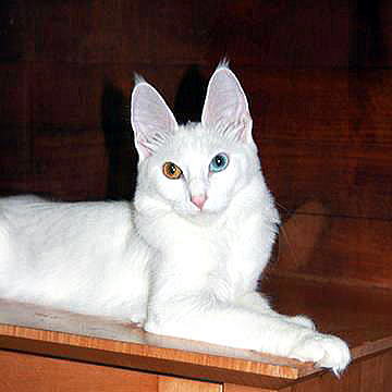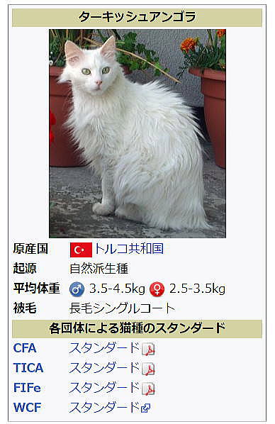 | 総合メニュー(西アジア) ターキッシュアンゴラ ターキッシュバン 次はトルコのターキッシュアンゴラです ◆ターキッシュアンゴラ ![]() Source:Wikipedi ![]() ターキッシュアンゴラ(Turkish Angora) Pablo1964, CC 表示-継承 3.0, リンクによる Source:Wikimedia Commons ターキッシュアンゴラ(Turkish Angora)は、トルコの山岳地帯における自然発生種の猫の一品種です。エレガントな外観と繊細なコートを持ち、敏捷で愛情深い中型の猫です。アンゴラはトルコ共和国の首都アンカラの古い呼び名です。 特徴 ![]() オッドアイドホワイトのターキッシュアンゴラ Marinday Turkish Angoras - 投稿者自身による作品, CC 表示-継承 3.0, リンクによる Source:Wikimedia Commons ![]() オッドアイのターキッシュアンゴラ Source:Wikimedia Commons 被毛は繊細で、絹のように光沢があり、非常に柔らかく手触りが良いシングルコート。アンダーコートはありません。 頭部は緩やかな曲線のV字型。 目はつり目がちでアーモンド型です。目色は、ブルー、アンバー、グリーンゴールド、グリーン、オッドアイがあります。 耳は付け根が幅広く、両耳の付け根の間隔は狭く、頭部の高い位置に立った耳の先は尖っていて飾り毛があります。 横顔は鼻から目の上までラインと、目の上から頭頂部までのラインからなります。 ボディはバランスの取れた優美で繊細な骨格に、無駄のないしなやかな筋肉。首は細長く、ボディも細く長いがシャム猫(サイアミーズ)やオリエンタルのようなチューブ状ではありません、胴の中央が卵を細長くした様にオーバル型です。胸幅は狭く、前足より後ろ足がやや長く腰高です。 コート(被毛)やボディの完成には3年程を要します。オスはメスより大きく成長します。 鳴き声の音色は高い。囁く様な鈴声からカン高い声まで個体により様々です。 歴史 マヌルネコから進化した小型の猫が、タタール人により飼いならされたと推測されています。 純粋な原種は、フランスの歴史には16世紀まで遡って記載があり、1900年代初期、ペルシャ猫の繁殖プログラムに取り入れられ、トルコ国外でターキッシュアンゴラは姿を消しました。その後、長毛の猫が単に「アンゴラ」と呼ばれた時代が長く続きます。 1950年代にトルコのアンカラ動物園で保存飼育されていたターキッシュアンゴラがアメリカ軍人により渡米、1968年にアメリカの愛猫家の血統登録団体CFA (The Cat Fanciers' Association, Inc.,)に登録され繁殖が続き現在に至りまする。 CFAではシャム猫やオリエンタルとの交雑を示す毛色(ラベンダー、チョコレート)や柄(ポインテッド)の猫は登録できないことで示される通り、自然派生種であることを尊重し、トルコの猫を元に他の猫種を入れずに繁殖されてきました。シャム (ネコ)猫、オリエンタルを始め、他の猫種を祖先に持つ猫はターキッシュアンゴラとしては承認されていません。 FIFéでもポインテッドパターン、カラーではチョコレート、ライラック、シナモン、フォーンは除外されています。 WCFも同様にポインテッドパターン、カラーではチョコレート、ライラック、シナモン、フォーンは除外されています。 TICAでは全てのカラーとパターンを認めています。 当初はホワイトのみがCFAに登録されていましたが、現在は多様なカラーとパターン(ラベンダー、チョコレート、ポインテッドを除く)のターキッシュアンゴラが作出され登録されています。 ターキッシュアンゴラとターキッシュバンは、どちらもトルコを発祥地とするが、気質、外観の特徴ともに大きく異なります。これらの猫種を維持してきたブリーダーらの努力による長年の改良の結果、その差分は著しい進化を遂げました。 アメリカではターキッシュアンゴラ、または略称としてターキッシュ、ターキーと呼びます。 性格 自由奔放で陽気、気ままで束縛を嫌います。愛情深く遊び好きで活発。ヒトにすり寄って甘え、肩に乗ることを好みます。 飼育 非常に繊細な毛質ですが、アンダーコートのないシングルコートは、もつれにくく手入れはしやすいと言えます。しかし非常に柔らかい毛質なので毛玉ができることもあります。 毎日丁寧にコーミングして抜け毛を取り除く必要があります。 エレガントな外見に反して運動能力は高く、敏捷で高いところに登ることを好みます。成猫になると落ち着いてきますが、じゅうぶんに運動できる環境が望ましいと言えます。 写真ギャラリー ![]() 高い場所を好みます Daly69 - 投稿者自身による作品, CC 表示-継承 3.0, リンクによる Source:Wikimedia Commons ![]() angora turc blanc yeux bleus Daly69 - 投稿者自身による作品, CC 表示-継承 3.0, リンクによる Source:Wikimedia Commons へつづく |