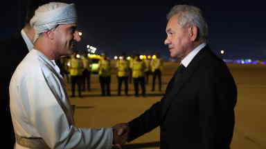 2025年11月11日、オマーン、マスカット空港での会談中の、ロシア安全保障会議事務局長セルゲイ・ショイグとオマーン国家安全保障会議事務局長イドリス・アルキンディ。©