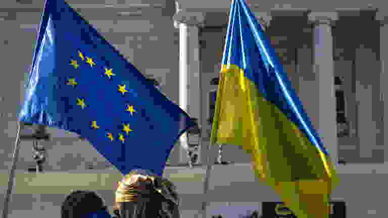 2025年8月30日、ポルトガルのリスボンでウクライナを支持する抗議者がウクライナとEUの旗を掲げる。© Luis Boza / NurPhoto / Getty Images