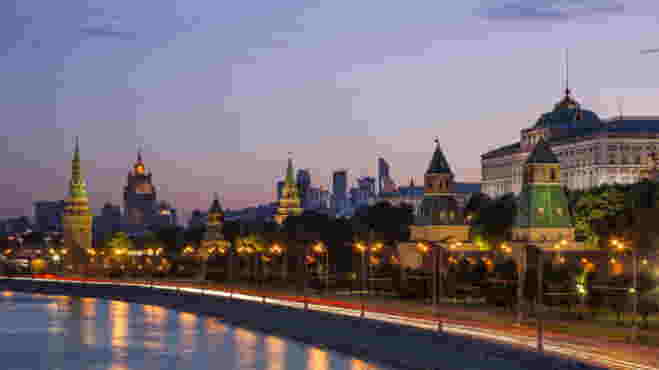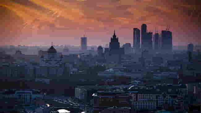 れのモスクワの空に残る飛行機雲】© Getty Images/Mordolff