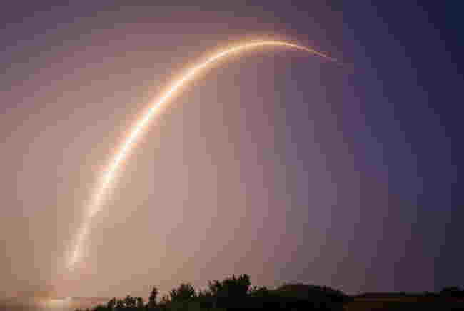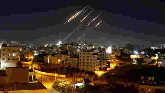 2025年6月15日、イランがイスラエルへの報復攻撃を再開した際、夜空にイラン弾道ミサイルの光跡が確認された。© Wisam Hashlamoun / Anadoluvia Getty Images